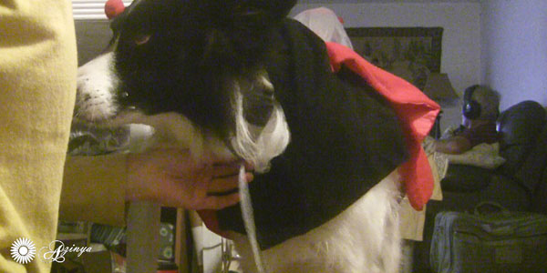 My Border Collie Daisy Dog & I whipped this inexpensive ghost costume up in a few minutes. It's easy to put on Daisy. If we were to go trick or treating with this costume, we'd need to trim the long ends, so Daisy doesn't trip, or trip someone else.